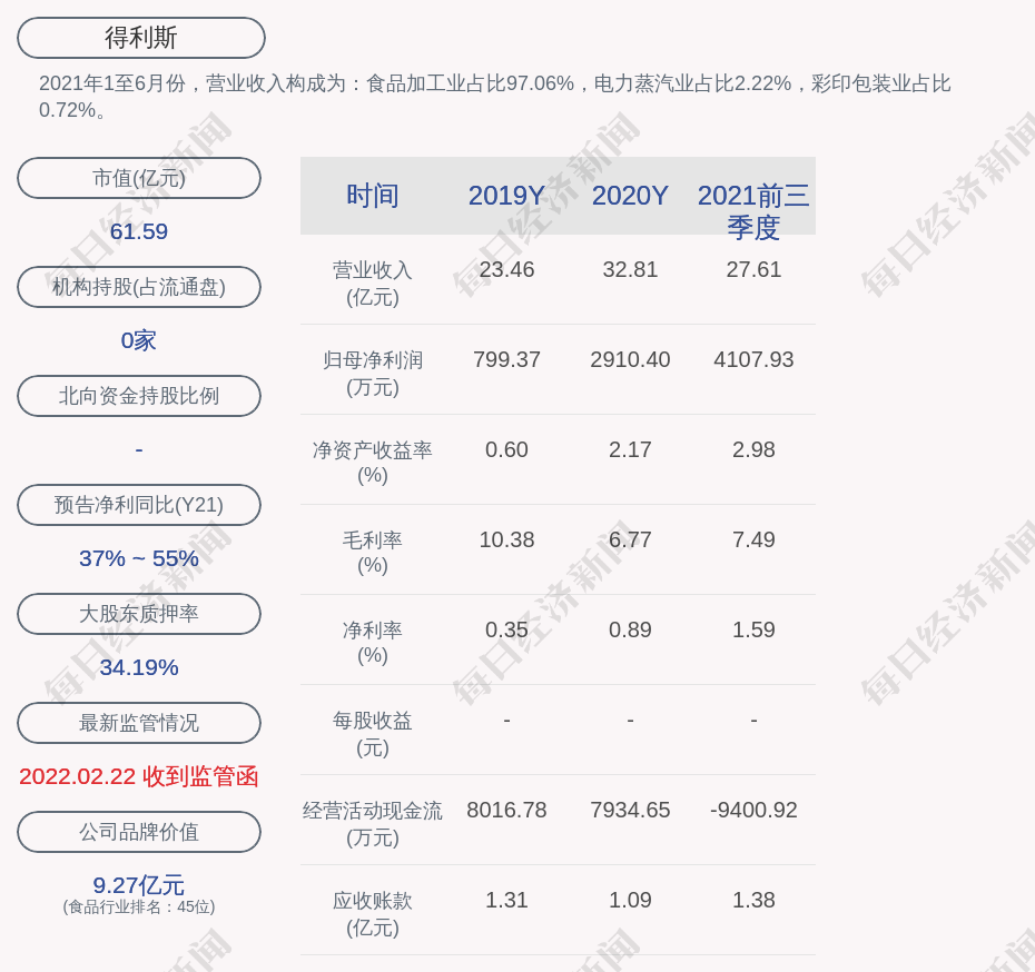 2021年1至6月份,得利斯的營(yíng)業(yè)收入構(gòu)成為:食品加工業(yè)占比97.06%,電力蒸汽業(yè)占比2.22%,彩印包裝業(yè)占比0.72%。