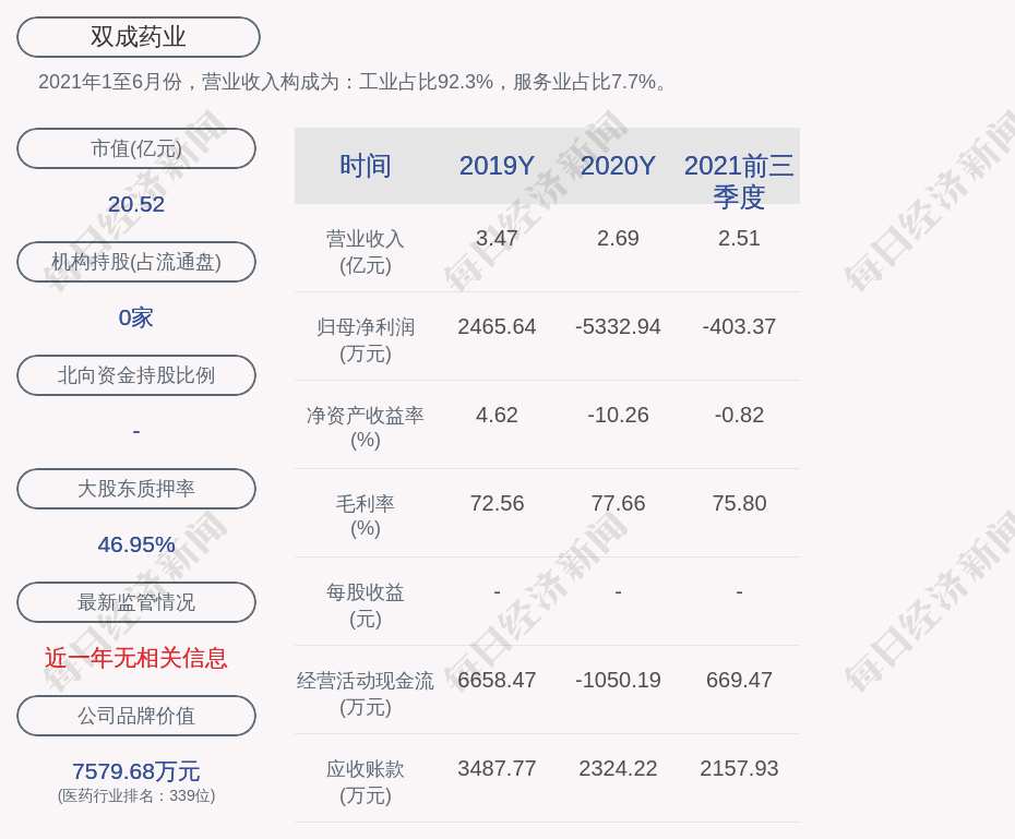 2021年1至6月份,雙成藥業(yè)的營(yíng)業(yè)收入構(gòu)成為:工業(yè)占比92.3%,服務(wù)業(yè)占比7.7%。
