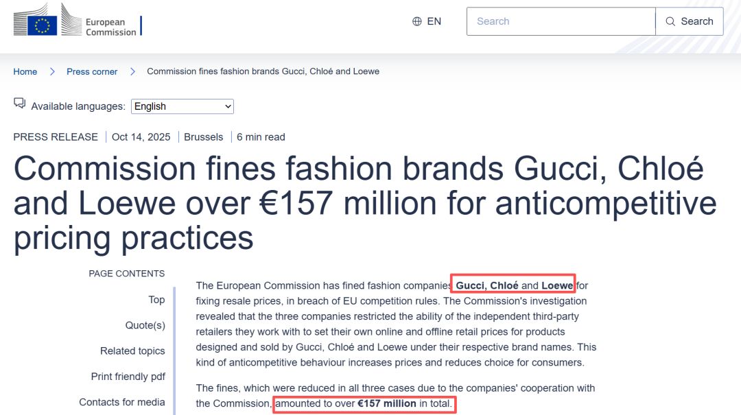 據(jù)新華社,歐盟委員會(huì)當(dāng)?shù)貢r(shí)間10月14日通報(bào),歐洲三個(gè)奢侈時(shí)尚品牌古馳、蔻依、羅意威限制第三方線上及線下零售商對(duì)其產(chǎn)品定價(jià)的行為“妨礙競(jìng)爭”,違反歐盟反壟斷法規(guī),對(duì)三家企業(yè)處以合計(jì)約1.57億歐元(約合人民幣13億元)的罰款。