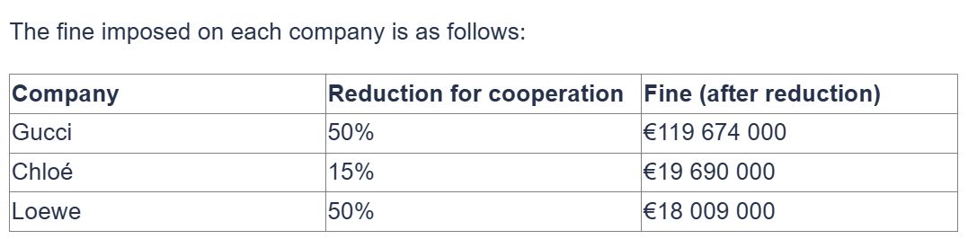 其中,古馳和羅意威的處罰金額均獲得50%的減免。歐盟委員會(huì)提到,罰款金額的減免反映了每起個(gè)案中合作的時(shí)間點(diǎn)和價(jià)值。