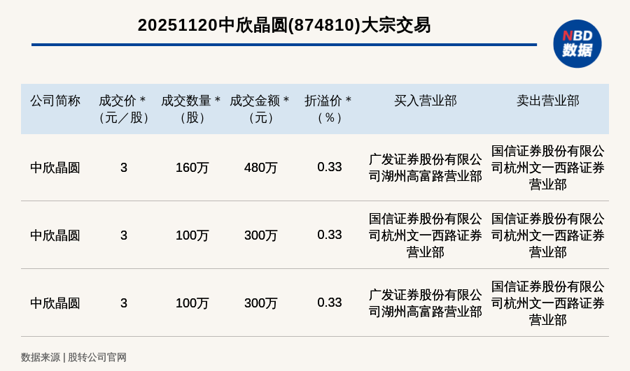 每經(jīng)訊,2025年11月20日,新三板創(chuàng)新層公司中欣晶圓(874810,收盤價(jià):2.99元)發(fā)生3筆大宗交易,總成交金額為1080萬(wàn)元,成交金額最高的一筆成交價(jià)3元/股,成交數(shù)量160萬(wàn)股,成交金額480萬(wàn)元,溢價(jià)0.33%。買入營(yíng)業(yè)部是廣發(fā)證券股份有限公司湖州高富路營(yíng)業(yè)部,賣出營(yíng)業(yè)部是國(guó)信證券股份有限公司杭州文一西路證券營(yíng)業(yè)部。