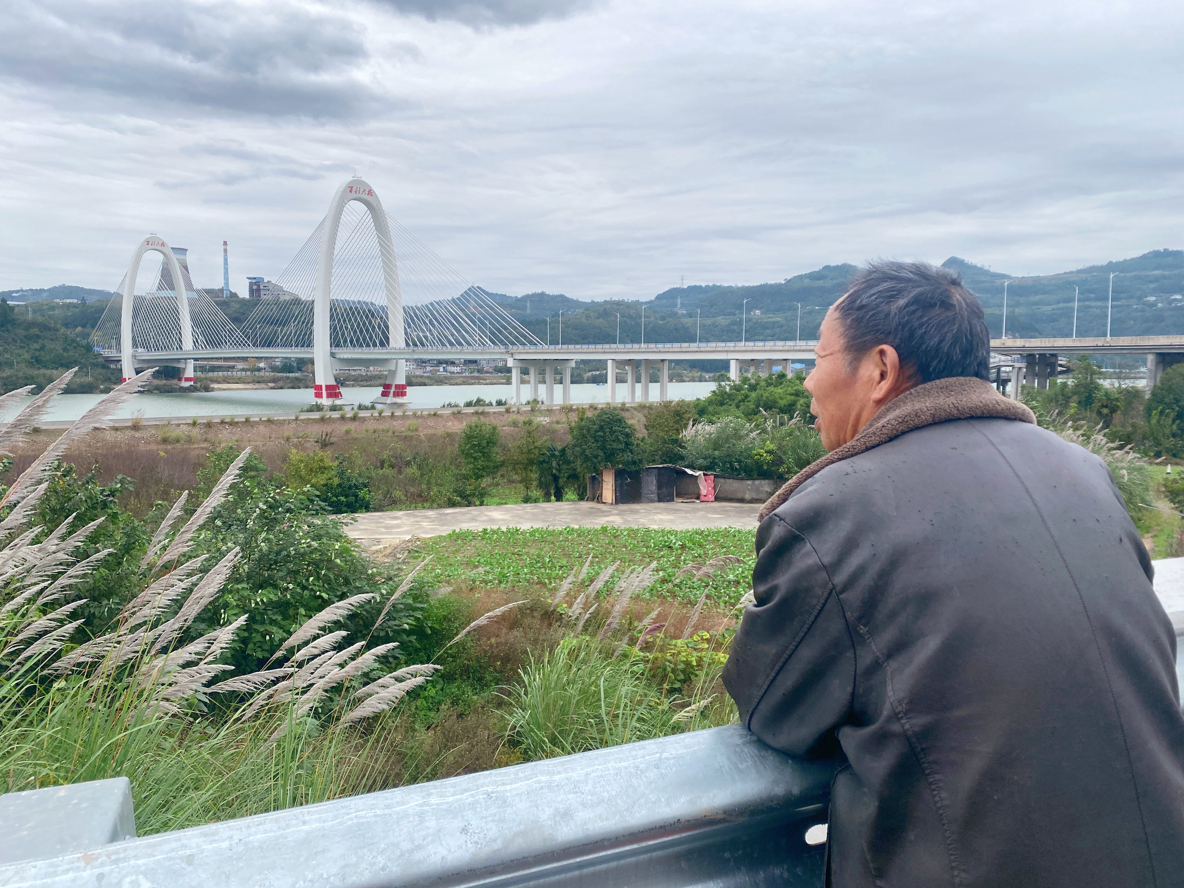 胡家梁社區(qū)居民寧顯培靠著百利大橋下行道路的圍欄,目光掠過橋下種植青菜的土地——那里曾是他的家,如今菜苗青嫩;再遠處,蒼溪縣嘉陵江百利大橋橫跨江面,車流往來不息。