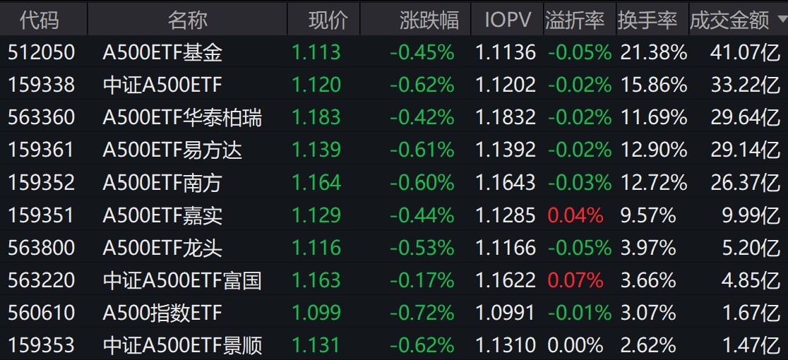 截至上午收盤,場內(nèi)跟蹤中證A500指數(shù)的ETF小幅下跌。其中,有10只中證A500相關ETF成交額超1億元,4只超29億元。A500ETF基金、中證A500ETF、A500ETF華泰柏瑞、A500ETF易方達早盤成交額分別為41.07億元、33.22億元、29.64億元、29.14億元。